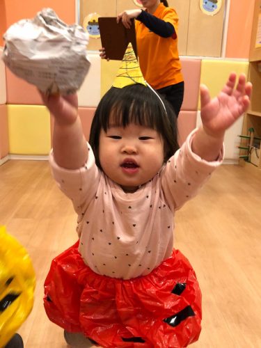 美味しいおやつを食べた後は豆に見立てた新聞紙のボールで豆まきごっこをします