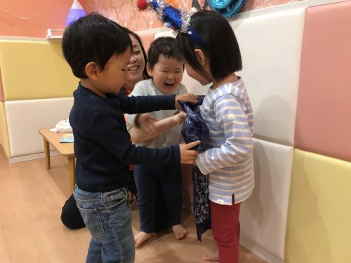 お友だちにお誕生日カードとプレゼントを渡してもらい、ふたり並んで「3さ~い?」