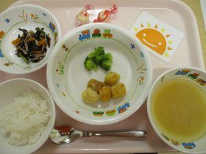 ご飯 味噌汁  魚のカレームニエル ひじきのサラダ キャンディーチーズ