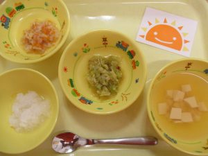 ご飯 すまし汁 魚の照り焼き キャベツのソテー キャンディーチーズ
