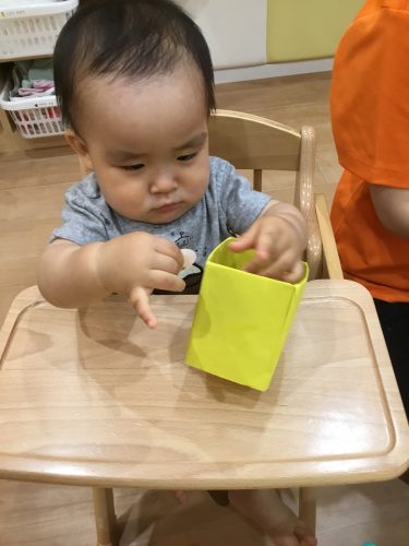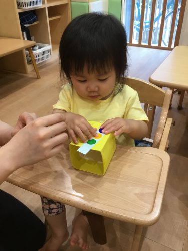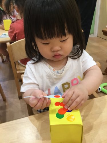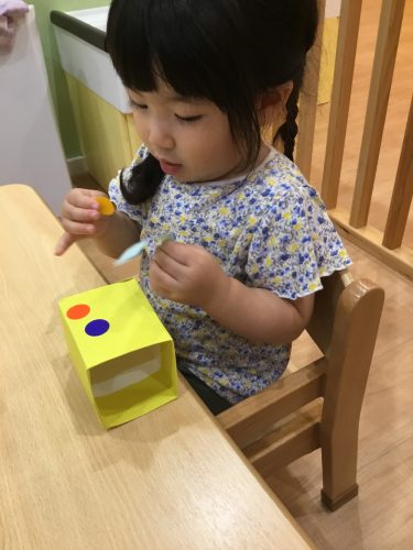 黄色の箱に色とりどりのシ-ルをペタペタ。2歳児クラスのお友だちは何度も経験しているので指先を上手に使いながらシ-ルを剝がし好きなところへペタ!「ママ嬉しい~って!」「パパ会社!」….etc