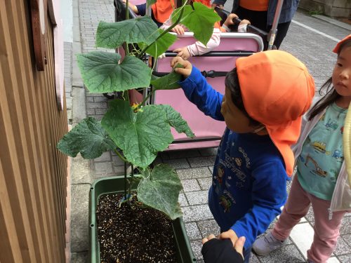 黄色のお花が咲いているのを見つけた?りんご組さんの少し不思議そうに見ている可愛らしい様子がこちらです。