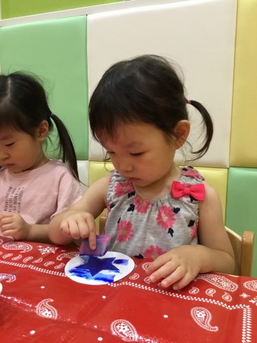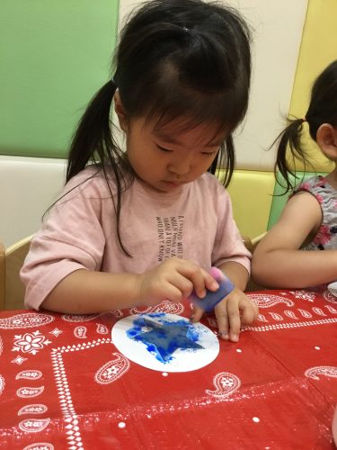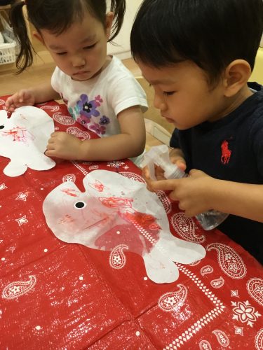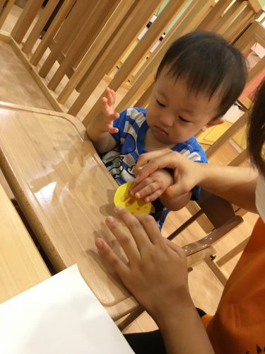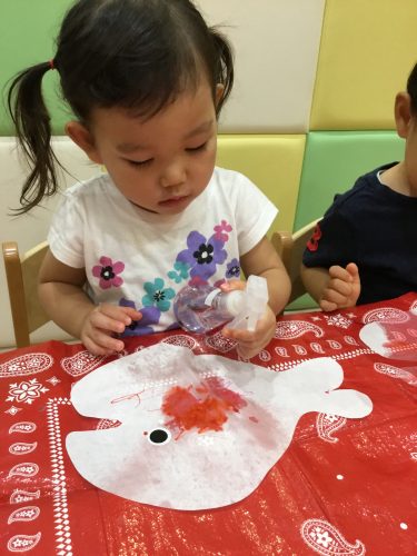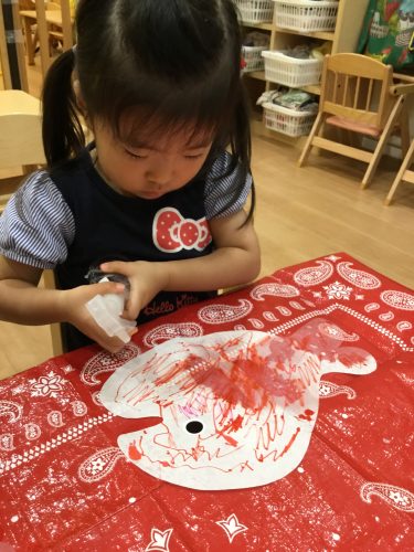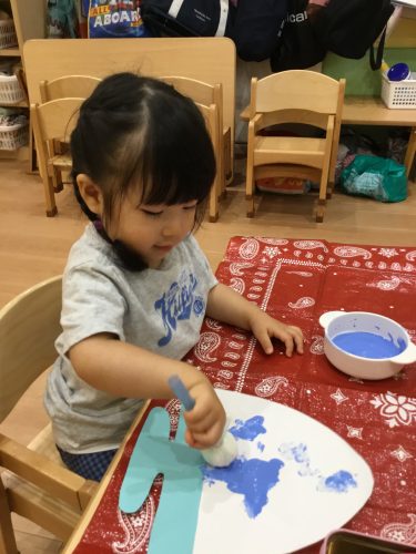 ?りんご組さんは、スポンジを使って「ポンポンポン♪♪」