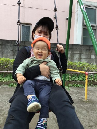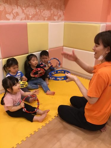 タンバリンを嬉しそうに持ち保育者と一緒にお歌を歌いながらスイング