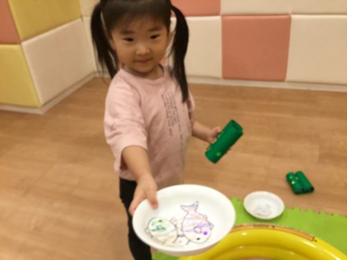 りんご組さんは、好きな色で塗り絵をしたお魚と、