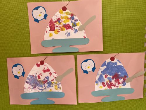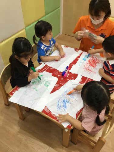 ?もも組さんは、手指や足に絵の具をつけて、「ペッタン!!」