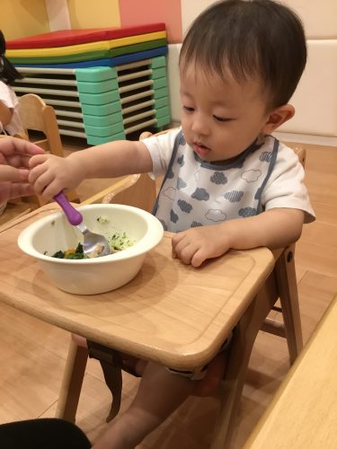 スプーンを握ってお給食を食べる練習中です✨
