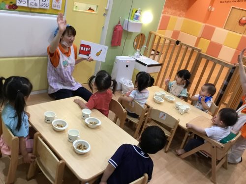 お食事前には、食に関する絵本の読み聞かせをすることで、食への興味や関心に繋がるように努めています^ ^