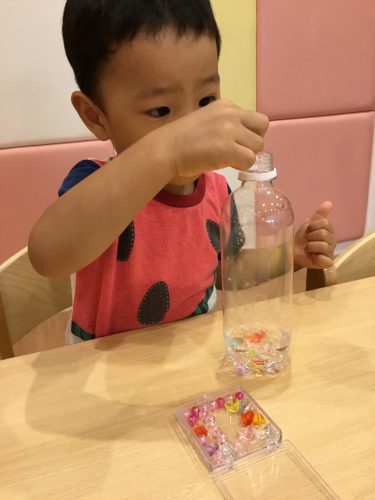 「ペットボトルの中に水とビーズを入れて…」