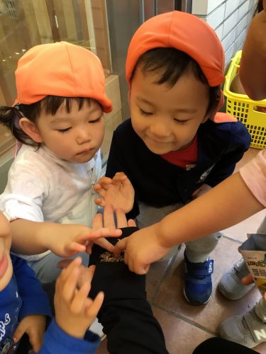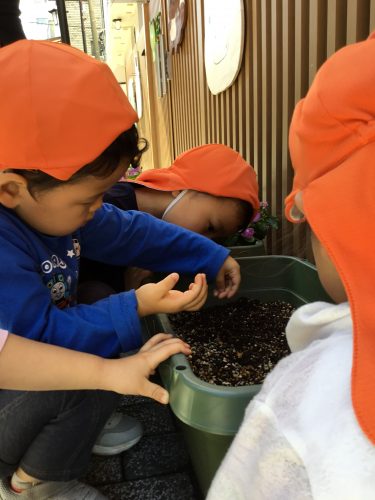 と初めて見るほうれん草のタネに興味津々なりんご組さんです?✨