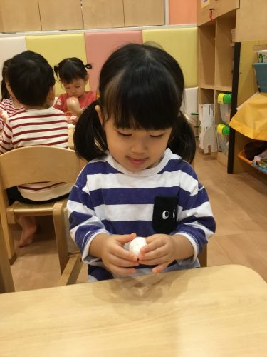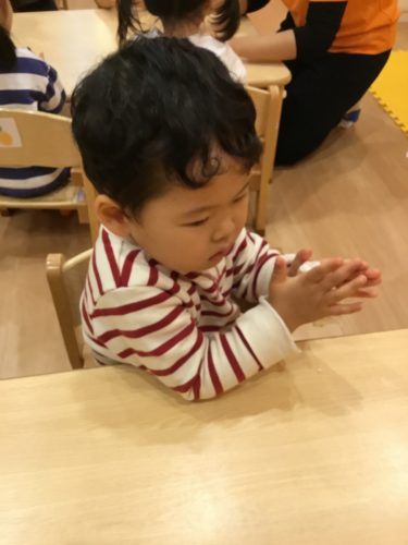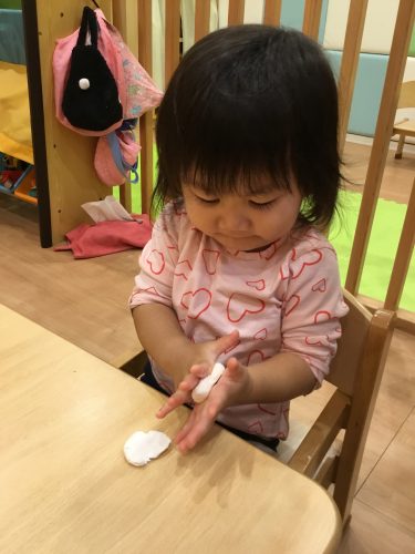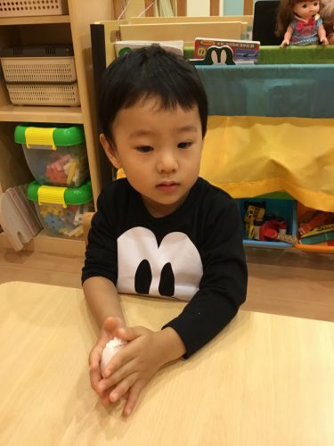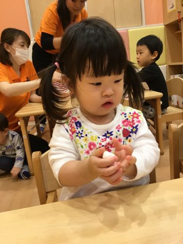 保育者のお手本を見てお子さま達も可愛らしいお手手でコネコネして