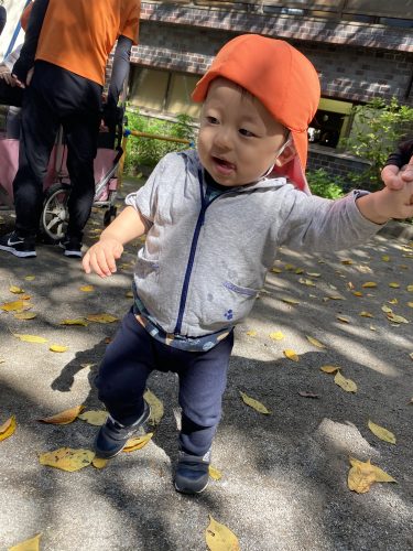 お子さま達は落ち葉を踏みしめたり、落ち葉拾いをしたりと