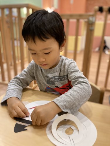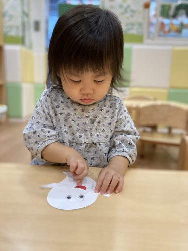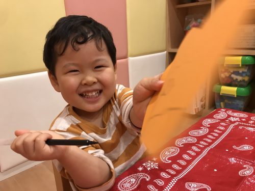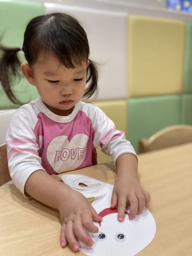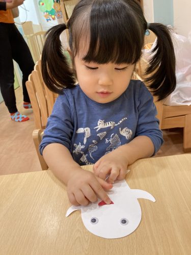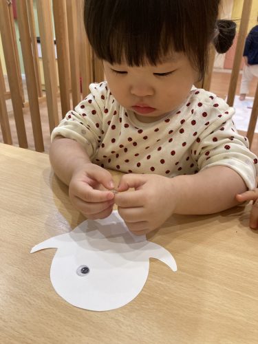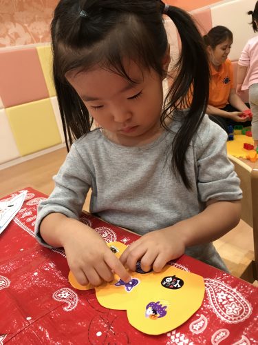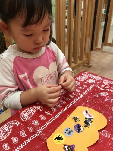 一枚貼れると「すごーーい!貼れたーー!」と盛大な拍手が?とても楽しみながらオバケのカバンを作ることが出来ました!
