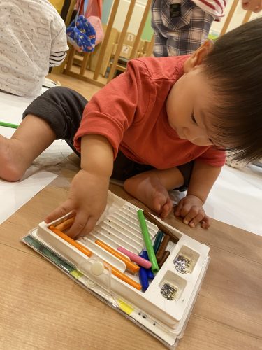 ??「シールいっぱい貼る!」と指先で小さなシールを剝がそうととっても集中し頑張っていました![]()