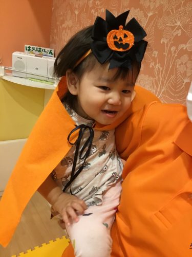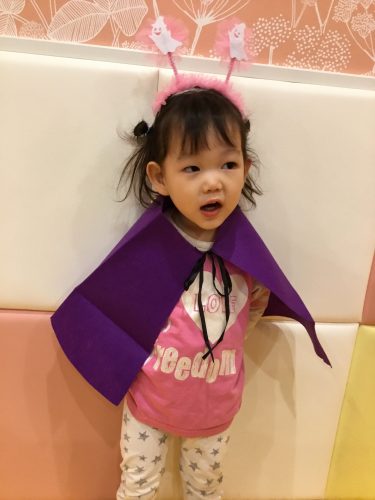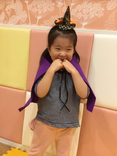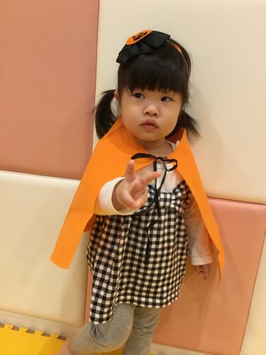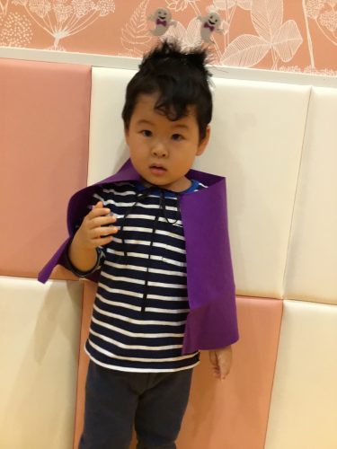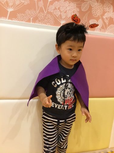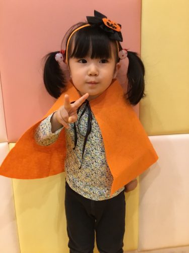 大好きなハロウィンの絵本の後は、朝から楽しみにしていた、カチュウシャをつけてマントをつけてハイポ―ズ?