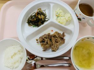 ご飯 味噌汁 豚のしょうが焼き 昆布の煮物 粉ふき芋