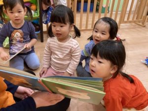 保育園で自分より小さなお友だちが保育者に読んでもらっていたのを真似しているのかもしれません。