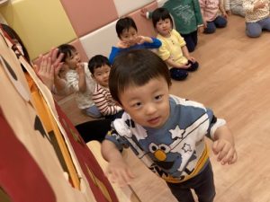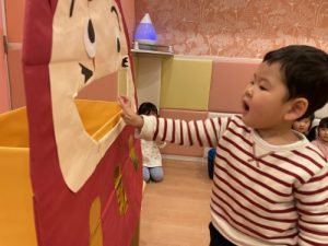みんなの大好きな?絵本に「だるまさん」というお話があります。0歳児のおとも達もとても親しみやすく何度かご紹介もさせていただきました大人気な絵本!その「だるまさん」が以前夏祭りで登場!今週久しぶりにみんなの前に登場すると「わ~い