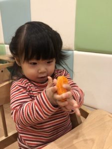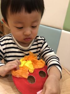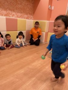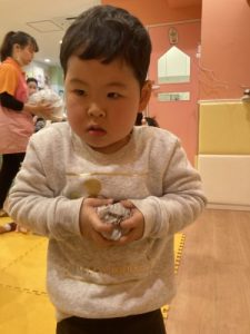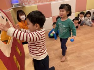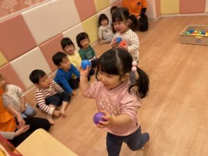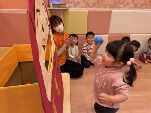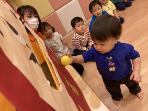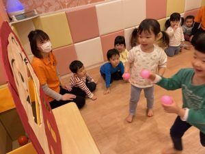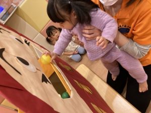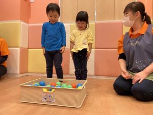 ?2歳児クラスのりんご組さんは保育者の話を真剣な表情で聞きます。保「緑のボ―ル1個と黄色のボ-ル1個だるまさんのお口に入れてあげてください」というと、慎重にはこの中からカラ―ボールを探し急いでだるまさんの口の中に![]()