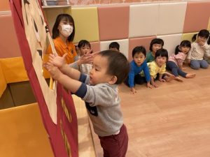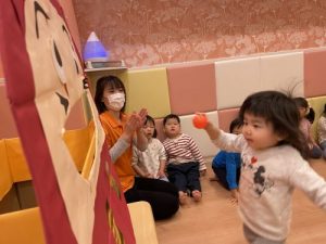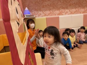?先週方の続き節分準備第2弾として?夕方お散歩から帰ってきてからの?絵本タイムでは「まめまきできるかな」の絵本に出てくる「鬼!」に真剣な表情で