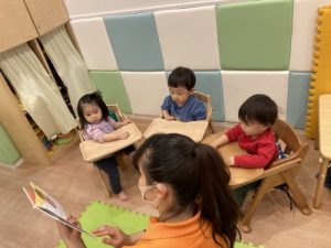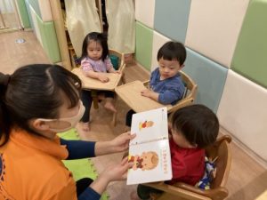 以前にもお伝えさせていただきましたが、もも組?さんも朝の会や、お給食の前、午睡前に読み聞かせを行っています♪