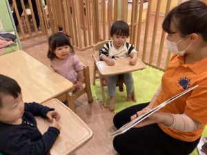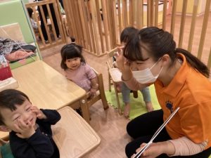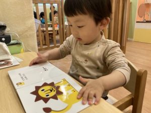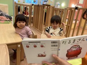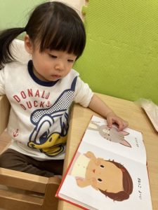 以前までは保育者が読み進めていくことが多かったですが、動きを真似したり、簡単な言葉を真似しようとする姿に成長を感じる日々です♪
