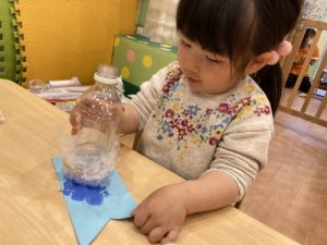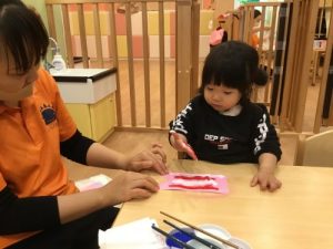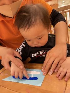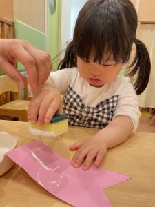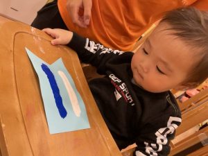 1歳児クラスの?いちご組さんは、お魚の形をした色画用紙に手や指で絵の具をぬりぬり。