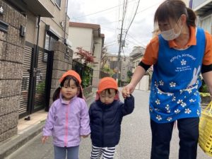 お散歩でも2歳児さんのお友だちが、1歳児さんのお友だちと手をつなぎ「〇〇ちゃんが〇〇君、守るね