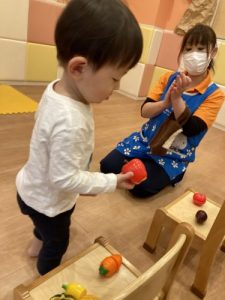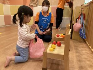 お気に入りの手提げを持ち職員の「?いちご一つと玉ねぎ一つ買ってきてね」という話を聞いて並んでいる果物や野菜の中から考えて手に取り手提げ袋に入れます。少しお兄さん、お姉さんになったので、お話をよく聞いて自分で考え順番に待つ