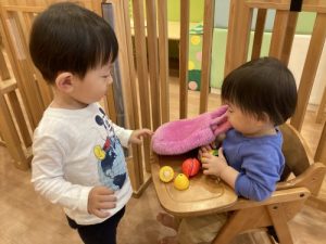 朝の自由遊びでは、新入園児さんのお友だちが登園してくると自分のお気に入りの車や玩具を手渡してくれたり、頭をなでて「いい子いい子