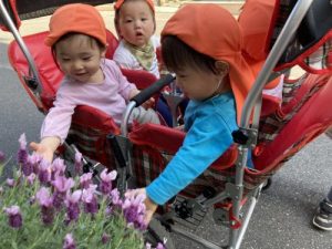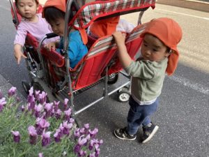 夕方散歩では、バギーに乗って園周辺をぐるっとしてきました?