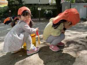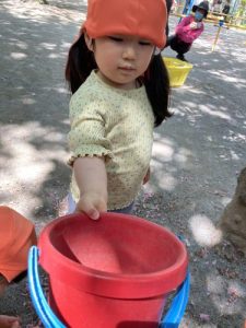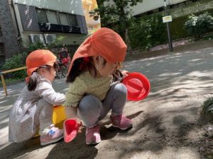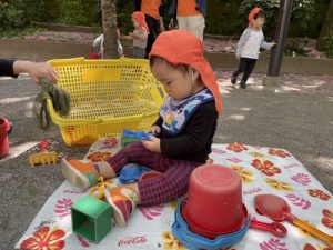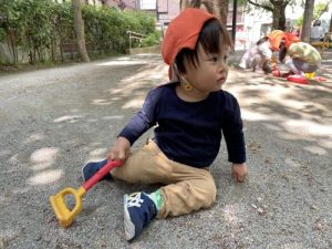 いちご組さんはスコップやカップを持って、お砂遊び?