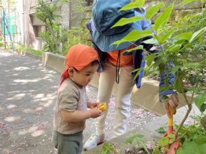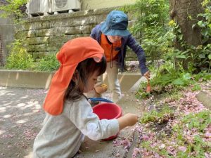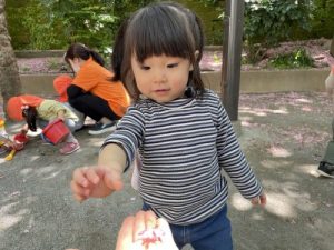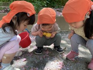 そして桜の花びらを見つけ、保育者に「どうぞ〜??」
