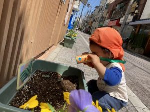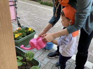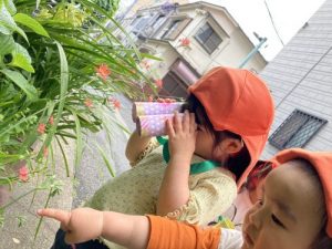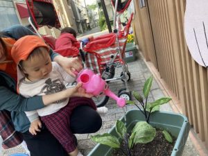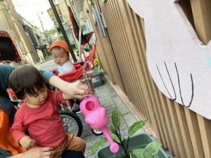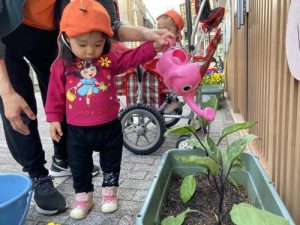 保育者が「大きくなぁれ」と声をかけると真似っこをして
