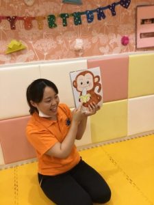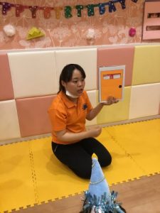 保育者が素敵なドアを持って来て『ドアの中に誰かいるね。みんなでトントンとドアを叩いてみよう』と言うと、お子さま達も一緒にトントン〜とその場でドアを叩いてくれました。