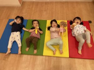 その日の夕方は、いっぱい遊んで疲れたのかマットの上でみんなでゴロゴロ。