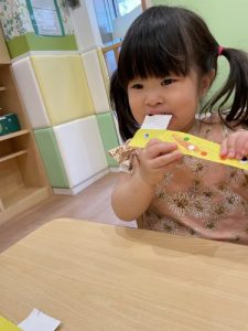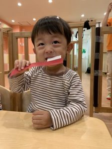 ご自宅でも、歯磨きを楽しめるように、くまさんのお口のカードと各自製作した歯ブラシをお渡ししているので、ご家庭でもお子さまと一緒に、スキンシップも兼ねてお歌なども歌いながら、練習したり、歯磨きを楽しんで安全に行って頂けると嬉しいです。幼児期は、歯磨きに興味を持てることと、習慣化することが大切なので、日頃から仕上げ磨きを行い、歯を大切にしていきましょう。乳歯やそしゃく力については、6月のほけんだよりもご参照ください。