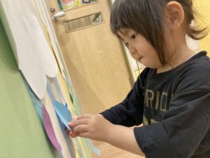 ?りんご組さんは楽しんでトイレに行けるよう、トイレに雲としずくのアートをお子さま達と一緒に製作をしました✨