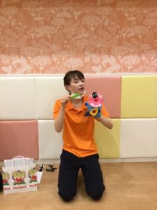 また、カバさんのお口を開き、お口の奥の歯は虫歯になりやすいため、しっかりママパパに磨いてもらうよう伝えました。