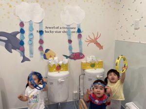 園のトイレが、梅雨時期ですが涼やかで楽しい空間に生まれ変わりました^ ^お子さま達は、しずくの向きなども考えながら、指先を器用に使いながら、製作してくれました。トイレが好きになり、オムツ卒業目指して、今月も楽しくトイレットトレーニングしていきたいと思います♪