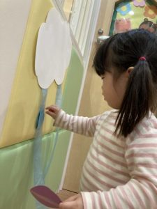 ?りんご組さんは楽しんでトイレに行けるよう、トイレに雲としずくのアートをお子さま達と一緒に製作をしました✨