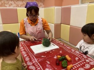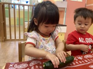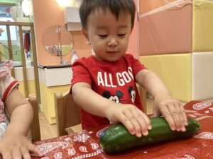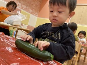いちご?組さんが、「ピー(マン)」「ッキーニ(ズッキーニ)」と保育者が伝えた野菜の名前を声に出しながら触っていた姿が印象的でした?