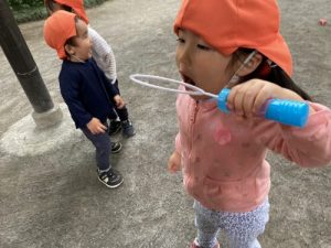 保育者がシャボン玉を吹いている姿を見て、「やりたい!」と挑戦してみると、