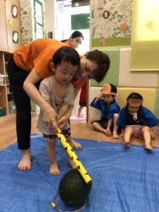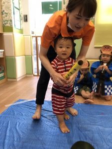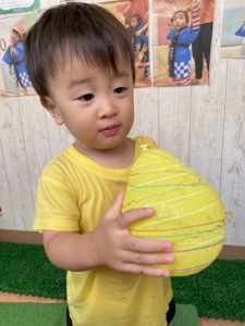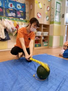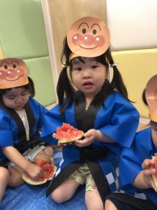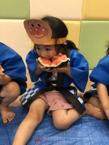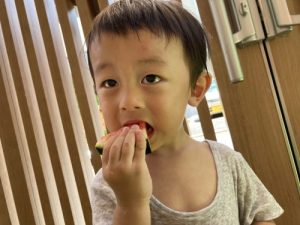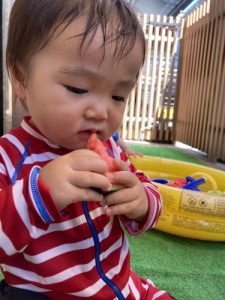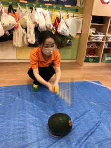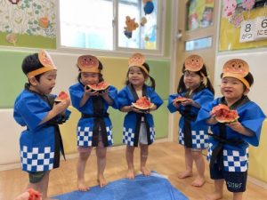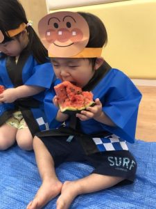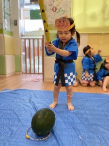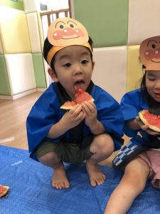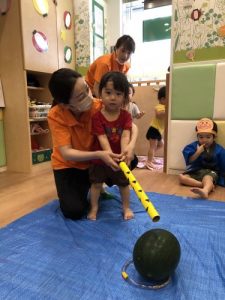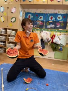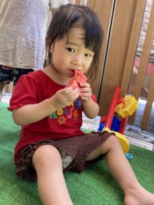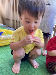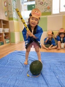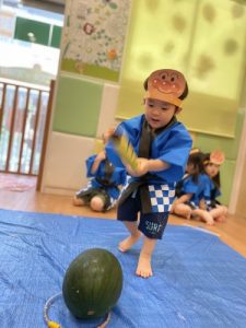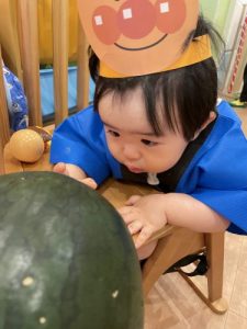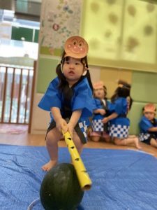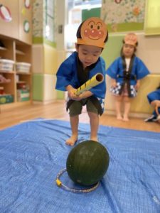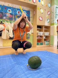 りんご組さんは力強く「えいっ!」と棒を振ったり、いちご組さんも可愛くチョンッとスイカを叩いてみたり、もも組さんは初めのスイカにギュッと触れてみたり、夏ならでは体験にドキドキわくわくしながら楽しみました?