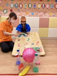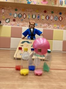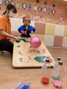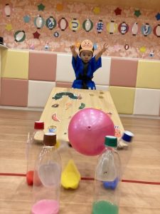 ボーリングのピン(ペットボトル)には、りんご組さんが色水を作ってくれました✨