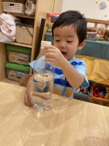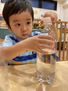 少し考えてからペットボトルを逆さまにしてみたり、転がしてみたり、振ってみたり、