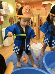 今年の夏祭りのテーマはズバリ、『絵本?』お神輿には「おべんとうバス」、ボーリングには「はらぺこあおむし」、魚釣りには「きんぎょがにげた」??