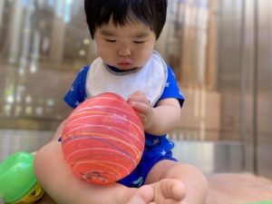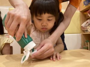 「反対に回すよ」と保育者が手を添えながら知らせると、小さな手を上手に動かして蓋を閉めてくれました?
