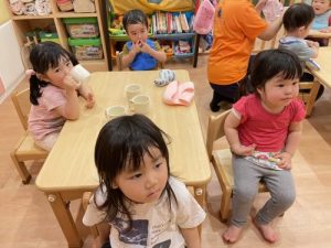 この日のお子様達は、公園でたっぷり遊んで汗を沢山かいたので水分補給をしながらお給食を待っています?