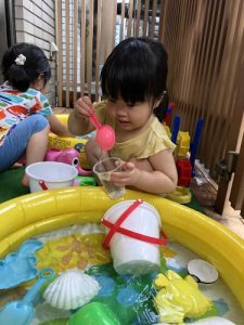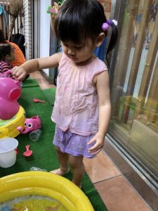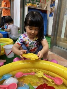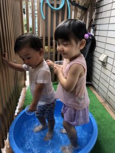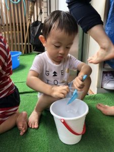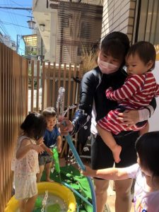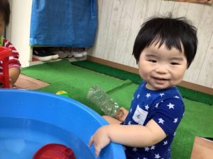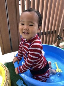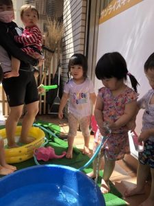 ?水遊びを始めたばかりの頃は、まだお水を怖がり、ドキドキして静かに遊んでいましたが、最近はお水にも慣れ、自らプールにザブンとつかったり、水鉄砲で楽しんだり、コップでお水を自分でかけて喜んだりと、みんなダイナミックに水遊びを積極的に楽しんでます![]()